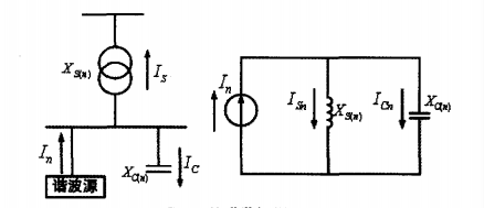 從圖中可以看出,諧波電流部分流經(jīng)XS(n),部分流經(jīng)XC(n),回路阻抗為: